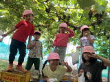 | 9月26日 プルーン・ぶどう狩りに行ってきました。 さくら組とまつ組さん、美味しそうにたくさん食べていまし た。途中から大雨になってきたので、お弁当は園に戻って いただきました。 |